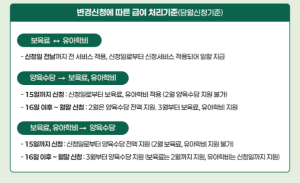 유효기간 중 양육 형태가 변경되거나 제도 기준이 개편되는 경우에는 지급 종료 또는 전환이 발생할 수 있으며, 이 경우 별도의 안내에 따라 보육료 제도 등 다른 급여로 전환 신청을 진행해야 한다.